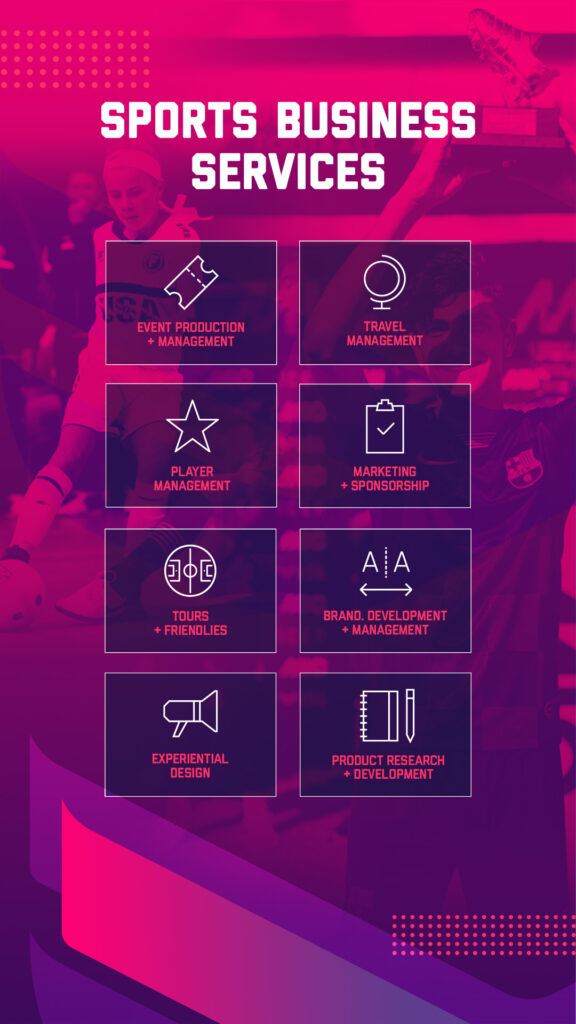 We have a variety of services to offer. To date there are 8 different ways in our portfolio to be able to engage with current clients and new potential customers. This includes everything from experiential design, brand development, marketing and sponsorship, event production, tours and friendlies, product research and development, travel management, and all the way to our player management arm. Each services works with one another to seamlessly achieve our clients goals.